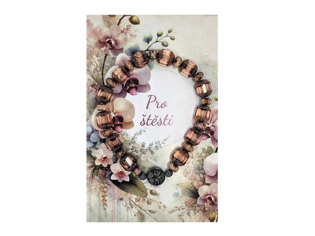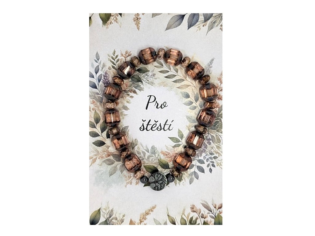 Tento náramek je vyroben ze skleněných perel s měděným leskem, který přináší sofistikovaný vzhled a připomíná krásu starobylých šperků. Každý náramek je ručně vyráběn s důrazem na detail a kvalitu. Je ideální jako doplněk pro zvláštní příležitosti nebo jako dárek pro někoho, na kom vám záleží.